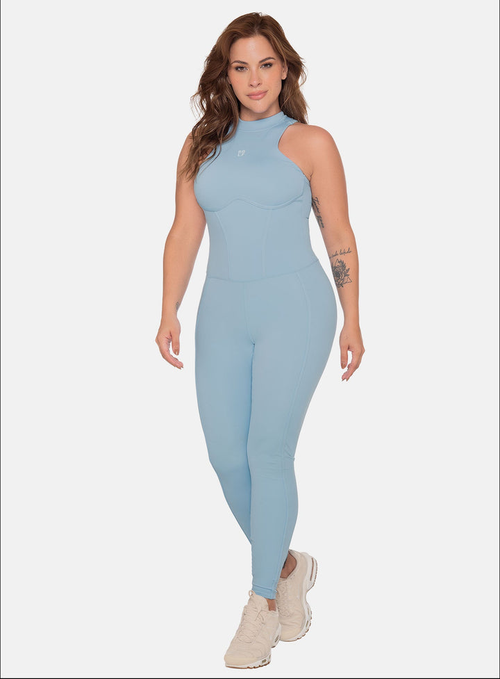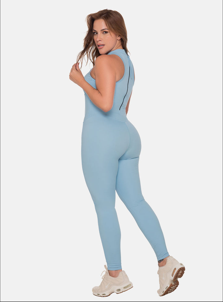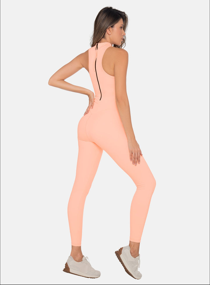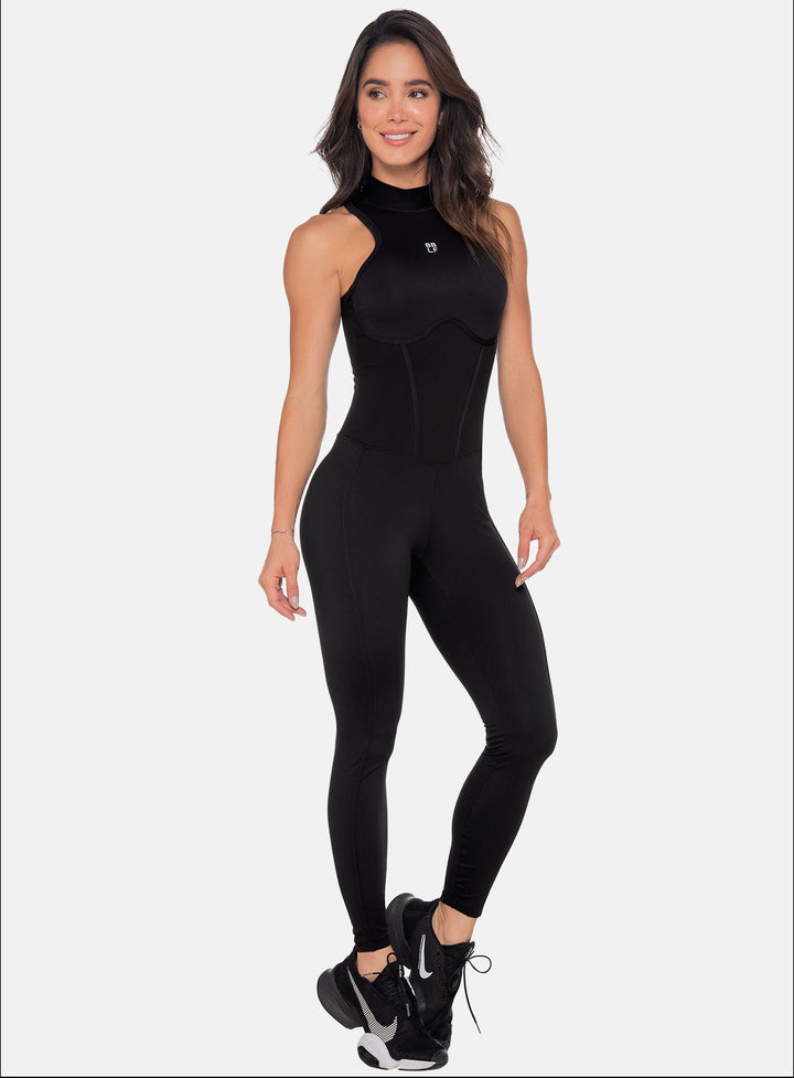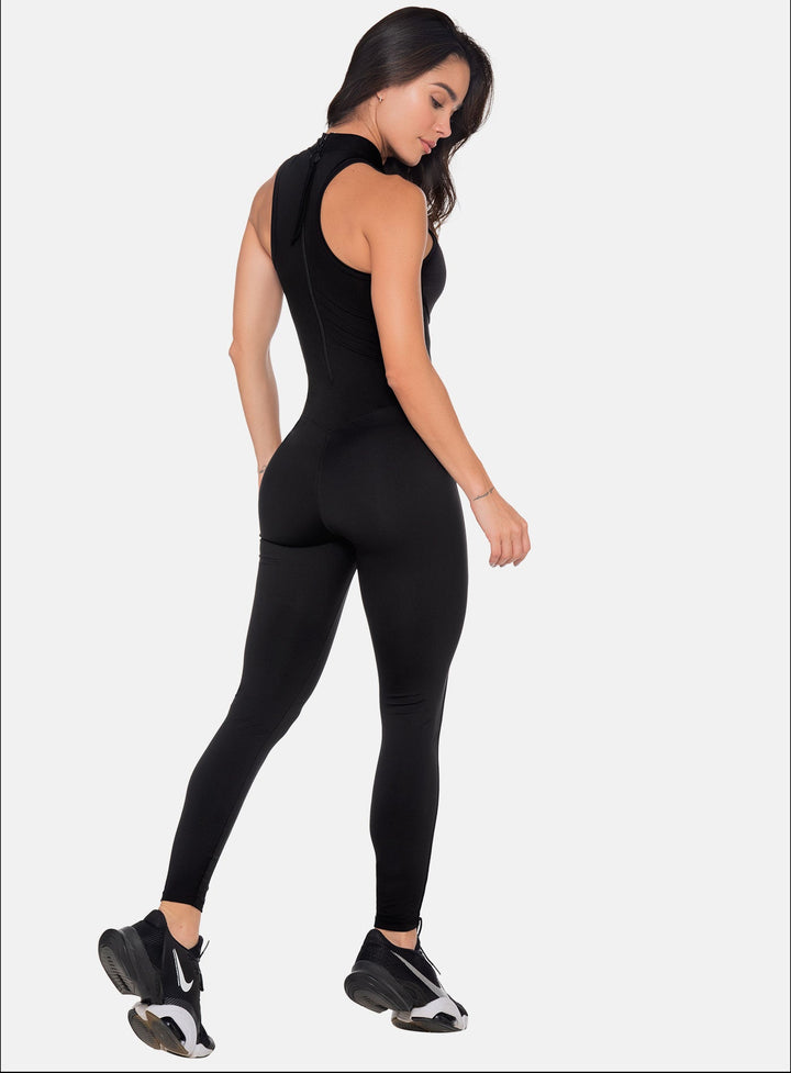 Long sports jumpsuit with sleeveless armholes, bust, front, and leg cutouts, high neckline, and back zipper.