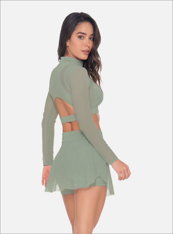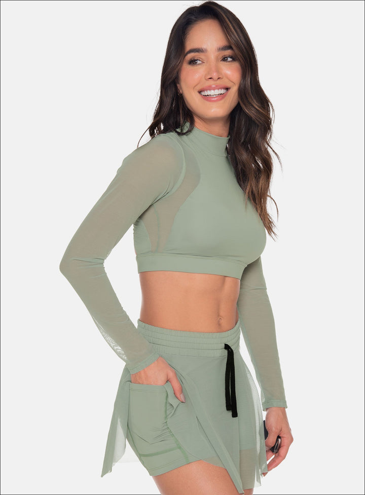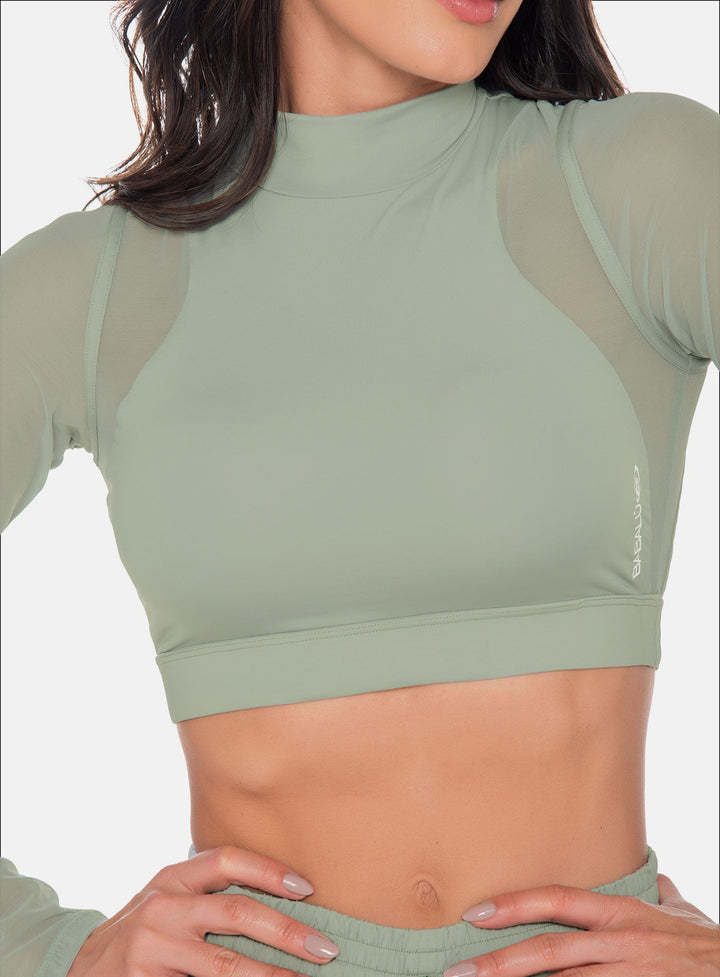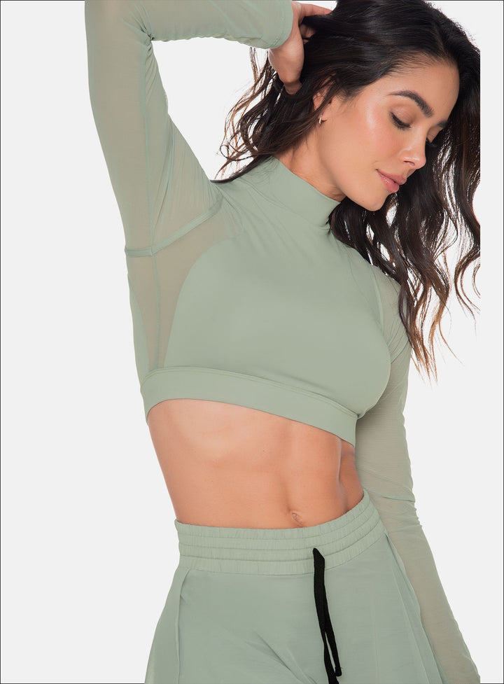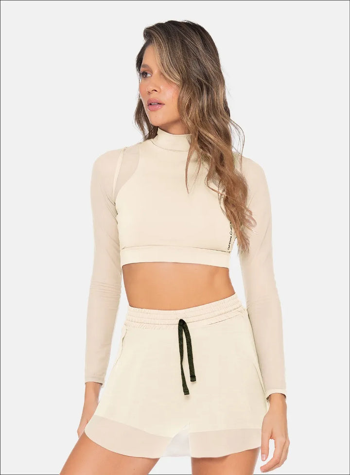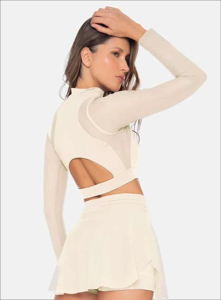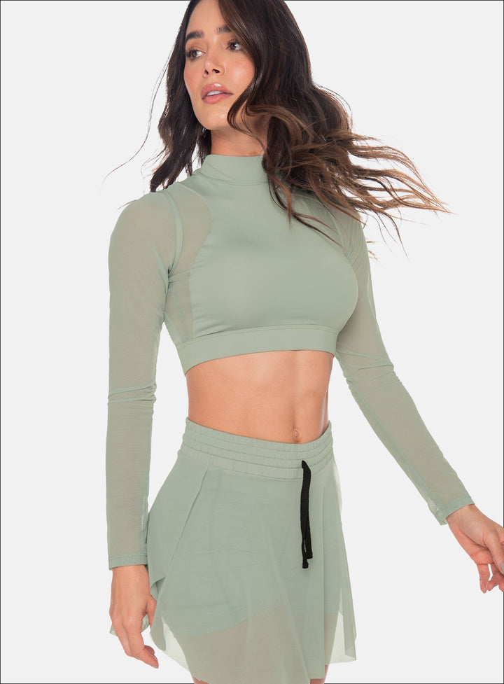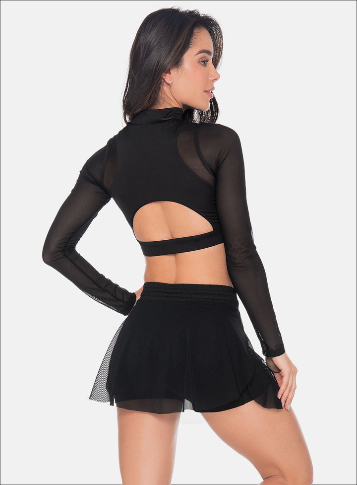 High-neck sports top with long sleeves, semi-sheer side panels, and an internal elastic waistband for a secure, comfortable fit. Includes inner lining and decorative semi-sheer cutouts for a stylish, breathable design.
