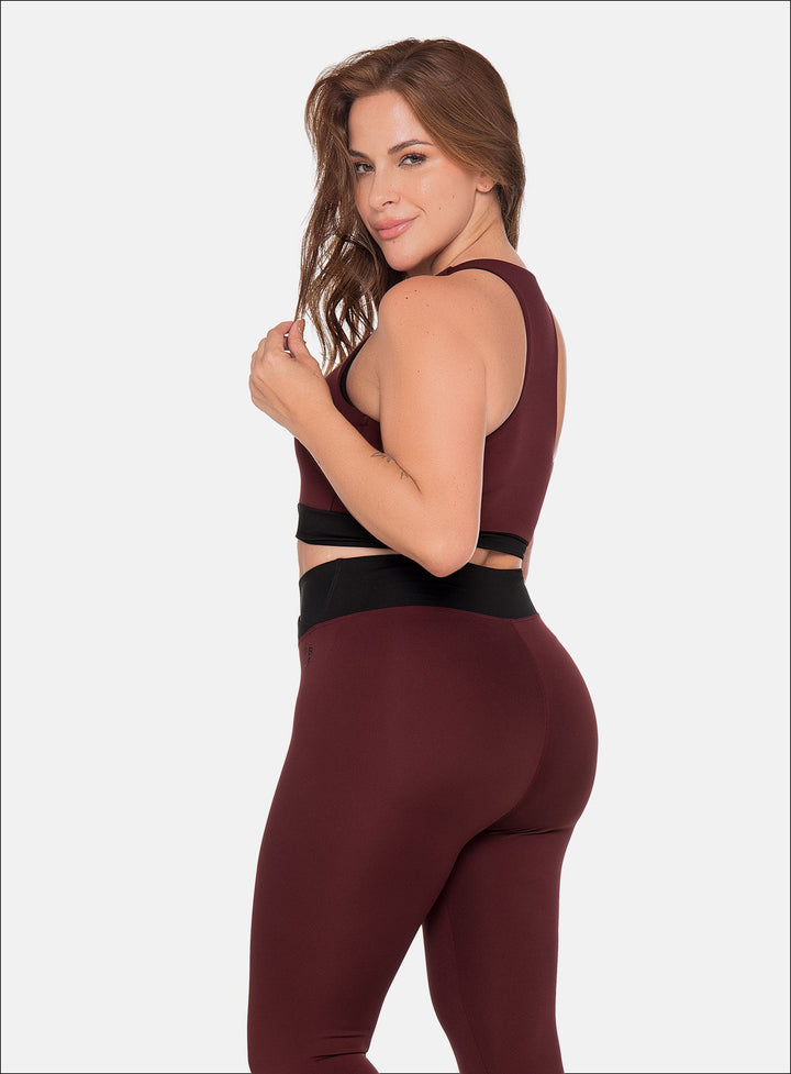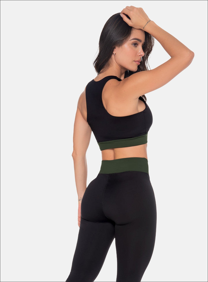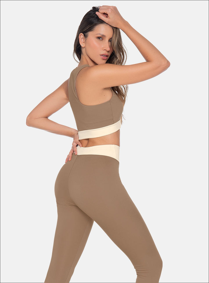 Sports top featuring an internal lining, front-contrast crossed waistband, and internal elastic for a secure fit.