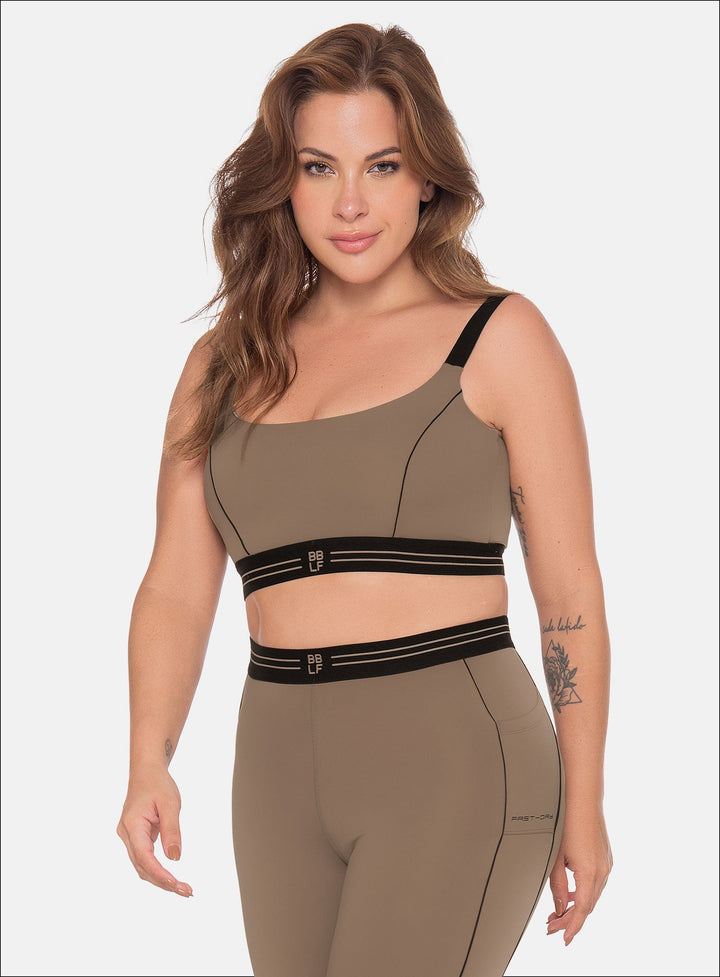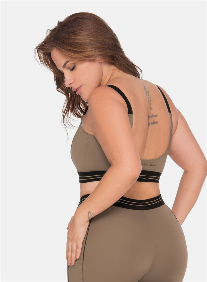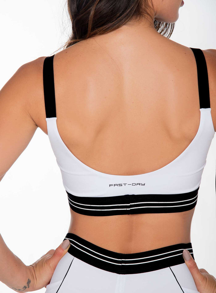 Sports top featuring exposed elastic straps, a slightly open back, and front cutouts with contrasting piping details. Includes inner lining, internal elastic for a secure fit, and printed exposed elastic accents for added style.