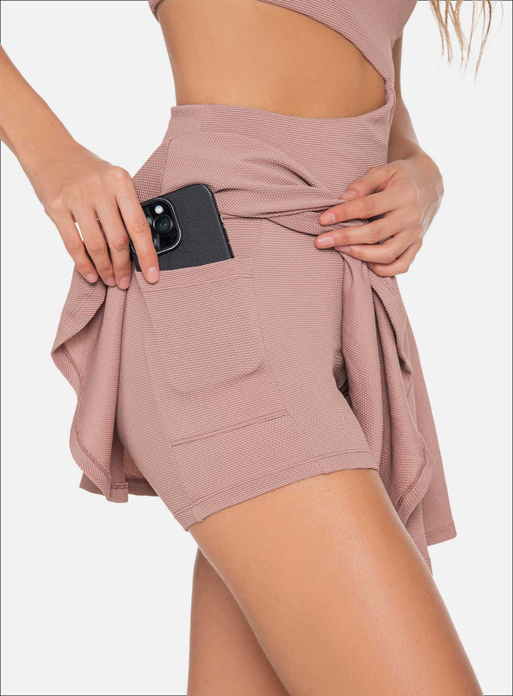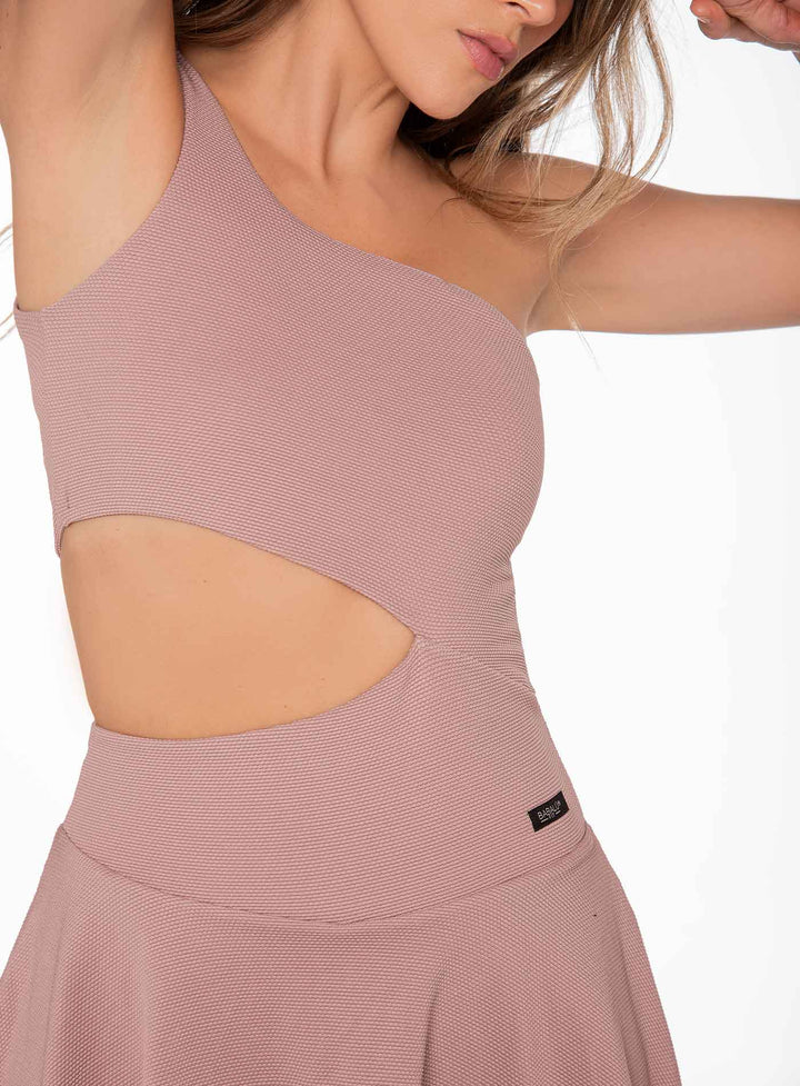 Short dress with an asymmetrical neckline, cut-out detail on the side, and side pocket on the built-in shorts.